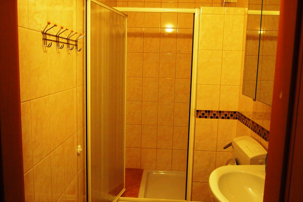 Baie proprie cu cabina de dus 120/90 cm, sampon de par, gel de dus, toaleta, lavoar, dulapior de baie pentru ustensile de igiena personala, uscator de par.